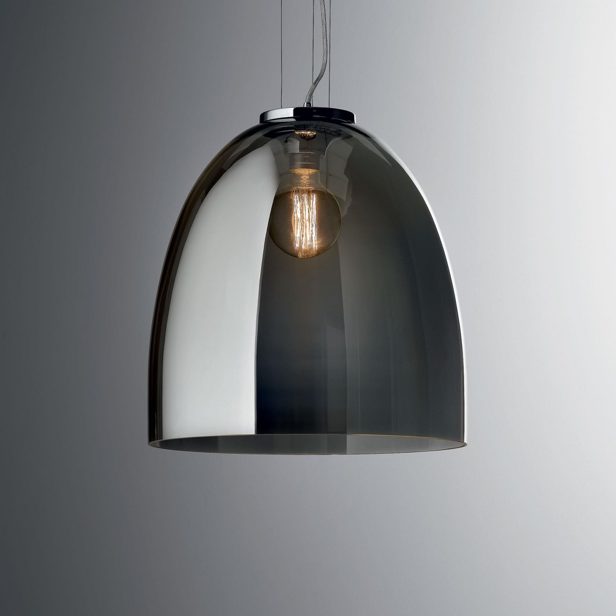 Die elegante Lampe besteht aus einem robusten Metallrahmen und mundgeblasenem Rauchglas. Der Vorteil ist die Anpassung der Länge der hängenden Stahlseile.