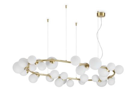 Dieser majestätische Kronleuchter ist mit 30 Kugeln aus opak weißem mundgeblasenem Glas ausgestattet, die der Lampe ein einzigartiges Aussehen verleihen. Die Stahlkabel, die den Kronleuchter halten, sind mit Gummi ummantelt, während dasElektrokabel aus PVC besteht und beide höhenverstellbar sind individuelle Anpassung von Umgebungslampen. Jeder Diffusor kann einfach durch Herausziehen von Hand entfernt werden, da er durch zwei Federklammern verriegelt ist, was einen einfachen Zugang für etwaige Wartungsarbeiten gewährleistet.