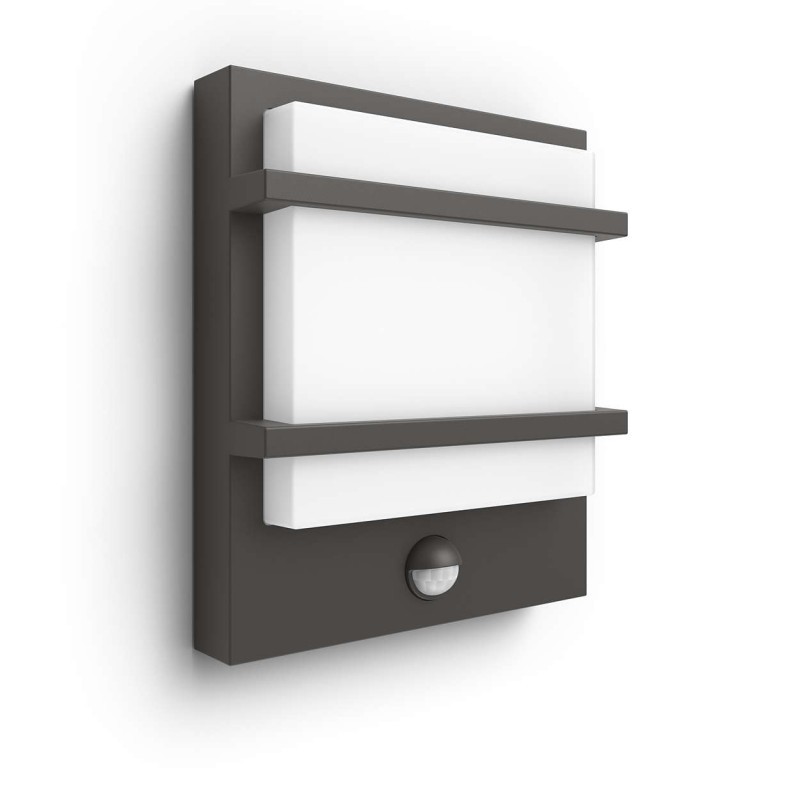 Die LED-Außenwandleuchte Petronia mit Bewegungssensor von Philips ist eine tolle Ergänzung für die Fassade Ihres Hauses. Die Wandleuchte hat ein modernes quadratisches Design und erhellt den Eingang nach Bewegungserkennung mit angenehm warmweißem Licht. Die Kombination aus Qualitätsaluminium in Farbe Anthrazit und milchweißem Kunststoff sorgt nicht nur für eine tolle Optik, sondern garantiert auch eine lange Lebensdauer der Leuchte auch bei anspruchsvolleren Outdoor-Bedingungen. Die Wandleuchte hat eine IP-Schutzart von IP44, die Schutz vor Feuchtigkeit und leichten Verschmutzungen garantiert. Der in die Leuchte integrierte Bewegungssensor warnt Sie bei jeder erkannten Bewegung. Sie beleuchtet immer im richtigen Moment den Gehweg oder die Eingangstür. Im gleichen Design sind auch Wandleuchten ohne Bewegungssensor im Angebot.Produktparameter