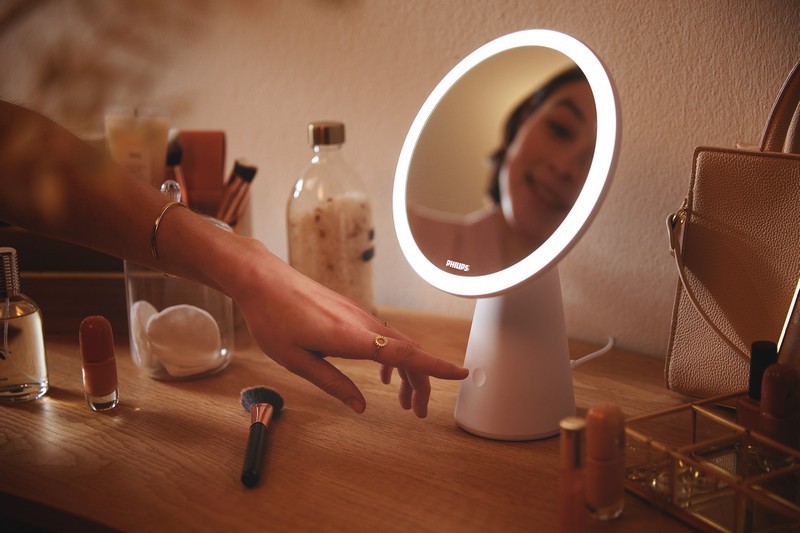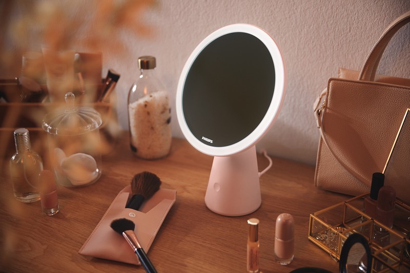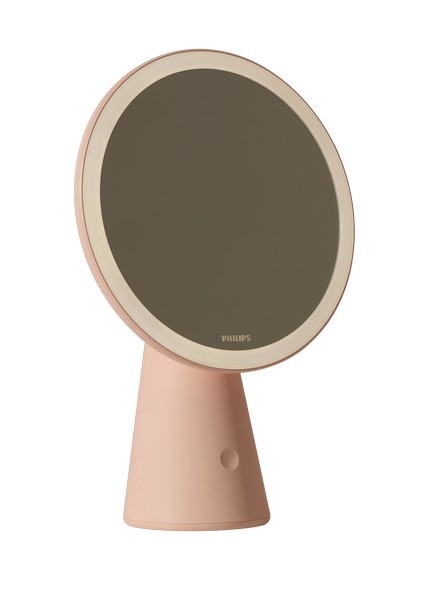 Philips 8719514420458 LED-Tisch-Touch-Kosmetiklampe mit Spiegel Mirror 1x4,5W | 60lm | 3000-5000K - USB, dimmbar, rosa
